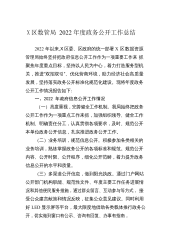 X区数管局2022年度政务公开工作总结2022年以来,X区委、区政府的统一部署X区数据资源管理局始终坚持把政府信息公开工作作为一项重要工作来抓聚焦年度重点目标,坚持以人民为中心,着力打造服务型机关,推进“双招双引”、优化营商环境,助力经济社会高质量发展,坚持落实政务公开标准化规范化建设。现将年度政务公开工作情况报告如下:一、2022年政府信息公开工作情况(一)高度重视,完善健全工作机制。我局始终把政务公开工作作为一项重点工作来抓,加强组织领导、健全工作机制、明确责任分工,认真贯彻各项要求,及时、规范公开本单位政务公开信息,扎实推进政务公开工作。(二)业务培训,规范信息公开。积极参加各类相关的业...