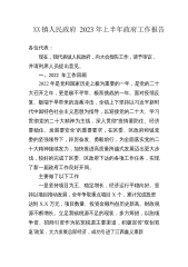 XX镇人民政府2023年上半年政府工作报告各位代表:现在,我代表镇人民政府,向大会报告工作,请予审议,并请列席人员提出意见。一、2022年工作回顾2022年是党和国家历史上极为重要的一年,是党的二十大召开之年,更是极不寻常、极富挑战的一年。面对疫情反复、极端干旱带来的连番冲击,全镇上下坚持以习近平新时代中国特色社会主义思想为指导,以迎接党的二十大、学习贯彻党的二十大精神为主线,深入贯彻“疫情要防住、经济要稳住、发展要安全”的重要要求,在区委、区政府和镇党委的坚强领导下,踔厉奋发、勇毅前行,为全面落实党的二十大精神接续发力,加快推进高质量跨越式发展迈出更大步伐,较好的完成了区委、区政府下达的各项...