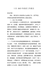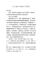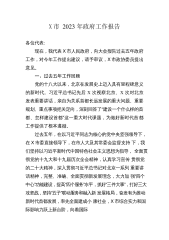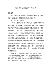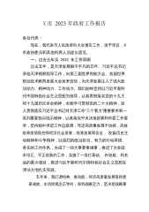 X市2023年政府工作报告各位代表:现在,我代表市人民政府向大会报告工作,请予审议,X市政协委员和其他列席人员提出意见。一、过去五年及2022年工作回顾过去五年,是天津发展极不平凡的五年。习近平总书记亲临天津视察指导工作,向第三届世界智能大会、首届世界职业技术教育发展大会发来贺信,为天津发展注入了强大政治动力、精神动力、工作动力。我们始终坚持以习近平新时代中国特色社会主义思想为指导,认真贯彻落实党的十九大和十九届历次全会精神,全面学习贯彻党的二十大精神,深入贯彻落实习近平总书记对天津工作“三个着力”重要要求和一系列重要指示批示精神,认真落实中央决策部署和市委工作要求,坚持稳中求进工作总基调,笃...