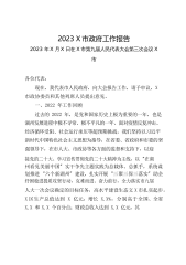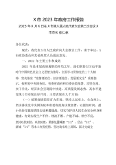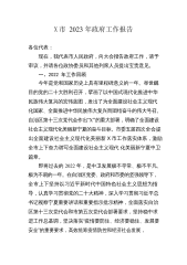 X市2023年政府工作报告各位代表:现在,我代表市人民政府,向大会报告政府工作,请予审议,并请各位政协委员和其他列席人员提出宝贵意见。一、2022年工作回顾今年是党和国家历史上具有里程碑意义的一年。举世瞩目的党的二十大胜利召开,擘画了以中国式现代化推进中华民族伟大复兴的宏伟蓝图,发出了为全面建设社会主义现代化国家、全面推进中华民族伟大复兴而团结奋斗的伟大号召。自治区第十三次党代会作出“X”的重大部署,明确了全面建设社会主义现代化美丽新宁夏的奋斗目标。市委五届四次全会提出全面建设社会主义现代化美丽新X市工作落实体系,激励全市上下奋力谱写全面建设社会主义现代化美丽新宁夏中卫篇章。即将过去的2022...