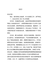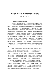 XX2022各位代表:现在,我代表XXX镇人民政府向大会做工作报告,请予审议,并请列席会议的同志提出意见。一、2022年以来主要工作回顾2022年以来,在区委、区政府的正确领导下,XXX镇认真贯彻落实区委区政府工作部署和要求,在打牢基层基础、加快工作落实上更加坚定,在维护社会稳定、解决民生问题上更加积极,在壮大村集体经济上更加主动,实施了一批群众期盼的基础性工程,解决了一些多年困扰发展的难题,办好了一批事关群众利益的惠民实事,全镇经济社会发展稳中向好,各项重点工作顺利推进。具体工作如下:(一)坚持人民至上,做好疫情防控——筑牢外防输入防线。本着对人民生命安全和身体健康高度负责的态度,镇党委政府...