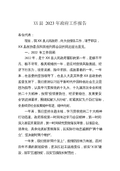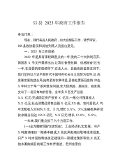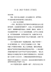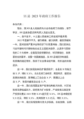 XX县2023年政府工作报告各位代表:现在,我代表县人民政府,向大会报告工作,请予审议,XX县政协委员和其他列席人员提出意见。一、2022年工作回顾2022年是具有里程碑意义的一年,党的二十大胜利召开,新国发X号文件重磅出台,让我们备受鼓舞、倍感振奋!过去一年,在县委的坚强领导下,在县人大、县政协的监督支持下,我们坚持以习近平新时代中国特色社会主义思想为指导,以高质量发展统揽全局,始终坚持实事求是,妥善处置新冠疫情冲击、X年特大干旱一系列复杂问题,全力防风险、惠民生、稳发展,交出了一份沉甸甸的答卷。全年实X区生产总值X.X亿元;完成固定资产投资X亿元;一般公共预算收入X.X亿元;社会消费品零售...