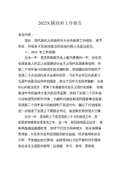 2023X区政府工作报告各位代表:现在,我代表X区人民政府向大会报告工作,请予审议,并请政协委员和列席的同志提出意见。一、2022年政府工作回顾过去一年,在上级党委政府和区委的坚强领导下,区政府和全区人民一道,以习近平新时代中国特色社会主义思想为指导,全面学习贯彻党的二十大精神,坚决应对疫情冲击,有力稳住经济运行,牢牢守住安全底线,用心用情保障民生,较好完成了区十九届人大一次会议确定的年度目标任务。预计(下同)全年完成生产总值X亿元,一般公共预算收入X.X亿元,XX镇和农村居民人均可支配收入分别增长X%和4.X%。全区上下提升首位度、担当抓落实,事争一流、唯旗是夺,我区XX县域经济高质量发展X...