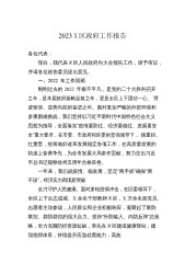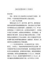 2023X区政府工作报告各位代表:现在,我代表区人民政府,向大会报告政府工作,请予审议,X区政协委员和其他列席人员提出意见。一、2022年工作回顾过去的一年是党和国家历史上极为重要的一年,更是颍州迎难而上、砥砺前行的一年,全区上下坚持以习近平新时代中国特色社会主义思想为指引,深入贯彻落实党的二十大精神和习近平总书记系列重要讲话指示批示精神,全面落实“疫情要防住、经济要稳住、发展要安全”的要求,在市委、市政府和区委的正确领导下,夺取了疫情防控和经济社会发展双胜利,实现了本届政府平稳开局。各位代表,疫情防控是2022年难以磨灭的印记。一年来,我们始终坚持人民至上、生命至上,因时因势调整优化疫情防控...