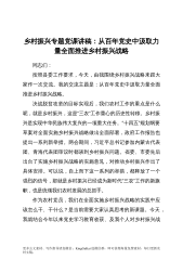 乡村振兴专题党课讲稿:从百年党史中汲取力量全面推进乡村振兴战略同志们:按照县委工作要求,今天,由我围绕乡村振兴战略来跟大家作一次交流。我的交流主题是:从百年党史中汲取力量全面推进乡村振兴战略。决战脱贫攻坚的目标实现后,我们农村工作的重点是什么呢,就是乡村振兴,这是“三农”工作重心的历史性转移。乡村振兴是实现中华民族伟大复兴的一项重大任务。“十四五”规划纲要草案对全面实施乡村振兴战略做出全面部署,政府工作报告也提出一系列新举措。两会期间,习近平总书记参加内蒙古代表团、青海代表团审议时都谈到乡村振兴问题。省委、市委先后出台了实施乡村振兴战略的实施意见,对推动乡村振兴作出了具体安排。可以说,自上而下...