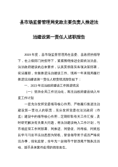 县市场监督管理局党政主要负责人推进法治建设第一责任人述职报告 2023年度,县市场监督管理局在县委、县政府的领导下,在上级部门的指导下,紧紧围绕推进全面依法治县、法治政府建设的总体要求,认真贯彻落实各项决策部署,依法履职,全面推进法治建设工作。现将一年来我局履行推进法治建设第一责任人职责情况报告如下: 一、2023年法治政府建设工作推进情况 (一)坚持全局工作法治化,将法治政府建设纳入年度工作计划 一是充分发挥党委领导核心作用。严格履行推进法治建设第一责任人的职责,充分发挥党委在法治政府(市监)建设中的领导核心作用,定期听取有关工作汇报,及时研究解决有关重大问题,将法治建设纳入工作计划...