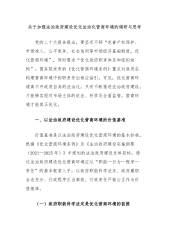 关于加强法治政府建设优化法治化营商环境的调研与思考党的二十大报告提出,要坚定不移“完善产权保护、市场准入、公平竞争、社会信用等市场经济基础制度,优化营商环境”,同时要求“优化政府职责体系和组织结构”。国务院发布的《优化营商环境条例》重点对政府在构建营商环境中的职责作出相应指引。可见,优化营商环境离不开政府自身的法治化,只有不断推进法治政府建设,才能够实现对市场主体的依法、科学及全面监管,营商环境才能真正优化。一、以法治政府建设优化营商环境的价值基准价值基准是以法治政府建设优化营商环境的基本标准。根据《优化营商环境条例》及《法治政府建设实施纲要(2021—2025年)》中规划的法治政府建设总体目...