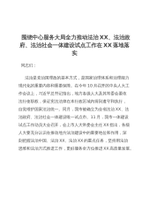 围绕中心服务大局全力推动法治XX、法治政府、法治社会一体建设试点工作在XX落地落实同志们:法治是党治国理政的基本方式,是国家治理体系和治理能力现代化的重要内容和重要保障。在今年10月召开的中央人大工作会议上,习近平总书记指出,地方各级人大及其常委会要依法行使职权,保证宪法法律在本行政区域内得到遵守和执行,自觉维护国家法治统一。同月,我市被确立为全省法治XX、法治政府、法治社会一体建设唯一试点市。11月,我市一体建设试点工作动员大会召开,会上市人大常委会主任XX指出,各级人大要充分认识在推动地方法治建设中的重要地位和作用,深刻把握法治中国、法治XX、法治XX的重点任务,坚持用法治思维和法治方式推...