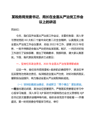 某税务局党委书记、局长在全面从严治党工作会议上的讲话同志们:今天,我们召开全面从严治党工作会议,主要任务是:深入学习贯彻党的XX大和二十届中央纪委二次全会精神,认真落实上级全面从严治党工作会议要求,总结2022年工作,部署2023年任务,一刻不停推进全面从严治党向纵深发展。刚才,××同志对纪检工作进行了安排部署,提出了明确要求,我都同意,请大家认真落实。下面,我代表区局党委讲三点意见:一、坚持扛牢政治责任,2022年全面从严治党取得新成效过去一年,我们在市局党委和×政府的正确领导下,坚决扛牢压实管党治党政治责任,纵深推进全面从严治党,对标对表抓落实,履职担当促提升,有力推动全面从严治党取得新成...