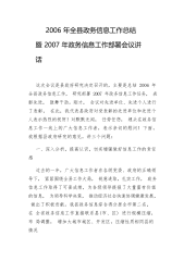 2006年全县政务信息工作总结暨2007年政务信息工作部署会议讲话这次会议是县政府研究决定召开的,主要是总结2006年全县政务信息工作,研究部署2007年政务信息工作任务,表彰先进,鼓舞干劲。刚才,会议对先进单位、先进个人进行了表彰,在此,我代表县政府对受表彰的先进单位和先进个人表示热烈的祝贺!对默默无闻,任劳任怨,埋头在政务信息工作一线上的广大信息工作者,表示亲切的慰问!下面,我根据县政府研究的意见,讲三个问题:一、深入分析,提高认识,切实增强做好信息工作的责任感过去的一年,广大信息工作者在各级党委、政府的正确领导下,紧紧围绕全县工作大局,锐意进取,扎实工作,政务信息工作取得了可喜成绩,为各...