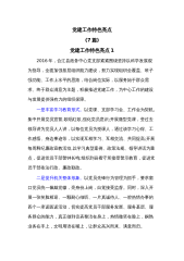 党建工作特色亮点(7篇)党建工作特色亮点12016年,合江县政务中心党支部紧紧围绕坚持以科学发展观为指导,全面加强基层组织能力建设,努力实现组织全覆盖、班子强功能、工作上水平的思路,结合岗位实际,以服务始于群众需求、终于群众满意为主题,积极推进党建工作,为中心工作的建设与发展提供强有力的组织保障。一是丰富学习教育形式。以党课、支部学习会、工作会为契机,集中开展党员宣誓,歌唱红歌,强化党员意识;开展微型党课,变过去领导讲为党员人人讲,以每位党员为授课人,通过谈学习心得、工作感悟、身边事迹等,以实现互相学习、互相交流、共同提高;开展每周释纪廉政宣教活动,以学习典型案例、政策法规、领导讲话为重点,促...