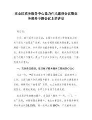 在全区政务服务中心能力作风建设会议暨业务提升专题会议上的讲话同志们:今天,我们召开这次会议,主要任务是深入贯彻落实上级关于深化“放管服”改革、优化营商环境的决策部署,总结回顾前一阶段工作,分析研判当前形势任务,对加强能力作风建设、提升业务服务水平进行全面部署。刚才,相关负责同志通报了近期工作情况,提出了下步工作安排,我完全同意。下面,我讲几点意见。一、充分肯定成绩,坚定做好政务服务工作的信心决心过去一年,**区政务服务中心紧紧围绕区委、区政府中心工作,以深化能力作风建设为抓手,以提升企业群众满意度为目标,持续深化“放管服”改革,大力推进政务服务标准化、规范化、便利化建设,各项工作取得了显著成效...