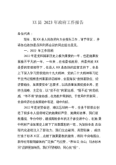 XX县2023年政府工作报告各位代表:现在,我代表县人民政府向大会报告工作,请予审议,并请各位政协委员和其他列席人员提出意见和建议。一、2022年工作回顾2022年,是党的二十大胜利召开之年,是全面落实县十四次党代会精神的第一年,也是新一届政府全面履职的第一年,在市委、市政府和县委的坚强领导下,在县人大、县政协的监督支持下,我们坚持以习近平新时代中国特色社会主义思想为指导,深入学习宣传贯彻党的二十大和习近平总书记来陕考察重要讲话重要指示精神,按照“疫情要防住、经济要稳住、发展要安全”的总要求,完整、准确、全面贯彻新发展理念,坚持稳字当头、稳中求进,高效统筹疫情防控和经济社会发展,统筹发展和安全...