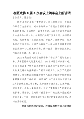 在区政协X届X次会议上闭幕会上的讲话各位委员、同志们:刚才,X书记发表了重要讲话,对区政协过去一年的工作给予了充分肯定,对今年的政协工作提出了新的希望和更高的要求。会议期间,区委X书记、X区长等区领导出席大会并参加小组讨论,与委员们共商X发展大计,共话民生关切,充分体现了区委区政府广听民声、善纳诤言、求真务实的工作作风。这将更加激励广大政协委员继续围绕区委区政府中心工作履职尽责、献计出力,推动全区政协工作再创新佳绩、再上新台阶。202x年是全面建成小康社会和“十三五”规划收官之年,具有里程碑式的重大意义。XJP总书记在考察浙江时,提出了浙江要“努力成为新时代全面展示中国特色社会主义制度优越性的...