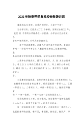 2023年秋季开学典礼校长致辞讲话尊敬的各位老师,亲爱的同学们,大家下午好!自办学以来,已经走过了X个春秋,回顾过去的XX年,我们XX中学的办学格局进一步拓展,办学活力充分迸发,办学水平逐步提升,办学成绩全面开花:一是中考成绩辉煌。连续九年名列崇左市前茅,是崇左市唯一一所每年中考全A人数能够保持在三位数的学校,是县内外高中学校优质生源基地,被评为全国文明校园。二是学生卓越成长。据不完全统计,从XX走出去的学子,考上211大学的已经超过XX人,考上985大学的已经超过XX人,考上清北线的有X人,其中有X人就读清北大学。三是教师卓越发展。我校已拥有县级以上优秀教师XX位,在教师参加各级各类比赛中,...