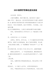 2023年秋季开学典礼校长致辞讲话敬爱的老师们,亲爱的同学们:大家上午好!九月的天空,孕育着大鹏展翅、雄鹰翱翔的梦想;九月的大地,承载着桃李不言、下自成蹊的骄傲!在这充满希望、富有诗意的季节,欢迎你们返校。这学期,我们迎来了千余名新生和XX位优秀的新老师,你们的融入,将给XX小学注入新鲜血液。在这里,请让我们用最热烈的掌声,对新同学和新老师的到来表示由衷的欢迎!九月是收获的季节,秋天从来属于辛勤耕耘的人。四年来,我们XX人风雨兼程、勇敢决断,顶住多方压力,突破棘手难关,积极探索实践,形成了两个校区管理的“六统一”模式,即师资统一调配、资源统一共享、课程统一设置、教学统一管理、质量统一监控、考试...