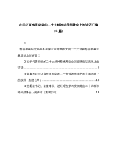 在党组理论学习中心组集体学习会上的讲话---《习近平谈治国理政》第四卷同志们:今天我们召开市局党组理论学习中心组集体学习会,主要是认真学习研讨《习近平谈治国理政》第四卷,带动全局上下拥护“两个确立”、做到"两个维护",让习近平新时代中国特色社会主义思想在XX落地生根、开花结果。《习近平谈治国理政》第四卷生动记录了以习近平同志为核心的党中央,面对百年变局和世纪疫情相互叠加、世界进入新的动荡变革期的复杂局面,面对世所罕见、史所罕见的风险挑战,统筹国内国际两个大局,统筹疫情防控和经济社会发展,统筹发展和安全,团结带领全党全国各族人民在中华大地上全面建成小康社会、开启全面建设社会主义现代化国家新征程的...