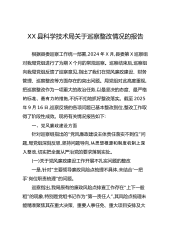 XX县科学技术局关于巡察整改情况的报告根据县委巡察工作统一部署,2024年X月,县委第X巡察组对我局党组进行了为期X个月的常规巡察。巡察结束后,巡察组向我局党组反馈了巡察意见,指出了我们在党风廉政建设、财务管理、巡察整改等方面存在的突出问题。局党组对此高度重视,把巡察整改作为一项重大的政治任务,以最坚决的态度、最严格的准、最有力的措施标,不折不扣地抓好整改落实。截至2025年9月16日,巡察反馈的各项问题已基本整改到位,整改工作取得了阶段性成效。现将有关情况报告如下:一、党风廉政建设方面“”针对巡察组指出的党风廉政建设主体责任落实不到位问题,局党组深刻反思,坚持问题导向,从思想根源和制度机制上...
