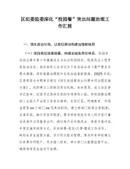 区纪委监委深化“校园餐”突出问题治理工作汇报一、强化政治引领,以高位推动构建治理新格局(一)坚持高位统筹部署,构建全链条责任体系。校园食品安全事关青少年健康成长与社会和谐稳定,既是民生工程更是政治任务。我区始终以总书记关于食品安全四个最严要求为根本遵循,将校园餐治理提升至政治监督新高度。2025年初,区委常委会专题审议通过《深化校园餐突出问题专项治理实施方案》,创新建立三级联动责任机制,在决策层,成立由区委书记挂帅、纪委书记具体负责的专项领导小组,将校园餐治理纳入全面从严治党主体责任清单;在执行层,明确教育、市场监管等xx个部门xx项具体职责,建立跨部门联席会商制度;在落实层,推行双签字制度,...