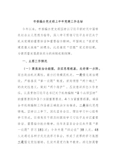 市中级人民法院党组上半年落实全面从严治党主体责任工作情况报告今年以来,市中级人民法院党组坚持以习近平新时代中国特色社会主义思想为指导,深入学习贯彻习近平总书记关于党的建设的重要思想特别是对机关党建工作的重要讲话和重要指示批示精神,坚持以“政治建院”为统领,以“党建引领”为先导,紧紧围绕“抓党建带队建促审判”主题主线,不断压实党建责任、积极创新党建机制、着力培树党建品牌,持续夯实基层基础,以高质量党建引领助推法院各项工作健康有序发展。一、主要工作情况(一)培根铸魂,铸就绝对忠诚政治品格。一是淬炼思想强信念。坚持不懈用党的创新理论凝心铸魂,严格落实“第一议题”制度,深化领学促学机制,去年以来,党组...