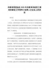 市教育局党组在2025年市教育系统党工委党的建设工作领导小组第二次会议上的讲话同志们:今天,我们召开市教育系统党工委党的建设工作领导小组第二次会议,主要任务是深入学习贯彻习近平总书记关于党的建设的重要思想,全面落实新时代党的建设总要求,总结上半年党建工作成效,部署下半年重点任务,以高质量党建引领保障教育高质量发展。下面,我讲三个方面意见。一、坚持政治统领,牢牢把握教育党建正确方向(一)以党的创新理论铸魂育人。坚持把学习贯彻习近平新时代中国特色社会主义思想作为首要政治任务,完善"第一议题"制度,建立"五学联动"机制。市直属学校全面推行党委理论学习中心组巡听旁听制度,开展"百名书记讲党课"活动,组...