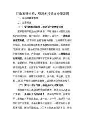 党建引领乡村振兴工作情况汇报:“四抓四强”作引领乡村振兴开新局一、抓支部建设增强基层组织战斗力一是建强基层组织促提升。将建强组织落实到抓班子带队伍、强学习提能力上,深入开展致富带头人培养,健全完善用党的创新理论武装头脑、指导实践、推动工作的制度机制,创新开设“八点半”课题,坚持支部书记示范讲、班子成员带头讲、田间地头现场讲,引导党员干部读原著学原文、悟原理,准确把握工作的目标方向、思路任务、主要举措。二是严肃组织生活促规范。持续深化党支部标准化建设,围绕实现常态长效、增强工作实效、质量突破提升,着力创新组织生活方式,让组织生活常态化制度化,坚持季度党员大会、月支委会和党小组会、半年一次党课,常...