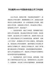 某市住XX乡建设局2022年政务公开工作总结今年来,在市委市政府的正确领导下,在市政务公开办的悉心指导下,我局政务公开工作着力健全制度机制,全面推进决策、执行、管理、服务和结果信息“五公开”,同步制定政策文件规定配套解读,主动提供信息公开服务,不断提高政务公开工作制度化标准化水平,使人民群众、社会各界更加了解、关心、支持和促进住房和XX乡建设工作。现将2022年政务公开有关工作总结如下:一、建立长效机制,推进政务公开工作常态化、制度化。(一)切实加强组织保障。根据人员变动情况,及时调整局政务公开领导小组,由局长任组长,其他领导班子成员任副组长,局机关及局属单位负责人为成员,领导小组办公室设在局...