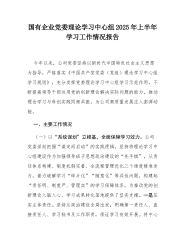 国有企业党委理论学习中心组2025年上半年学习工作情况报告今年以来,公司党委坚持以新时代中国特色社会主义思想为指导,严格落实《中国共产党党委(党组)理论学习中心组学习规则》,充分发挥党委理论学习中心组学习示范作用,不断提高领导干部运用党的创新理论解决实际问题的能力,推动理论学习与科创实践同频共振,为公司高质量发展注入澎湃动能。一、主要工作情况(一)以“系统谋划”立根基,全面保障学习效力。公司党委深刻把握“谋定而后动”的实践逻辑,坚持将理论学习中心组建设作为加强领导班子思想政治建设的“先手棋”,从责任体系构建、制度机制完善、全流程管理优化三个维度精准发力,着力破解学习“碎片化”“随意化”等共性问...