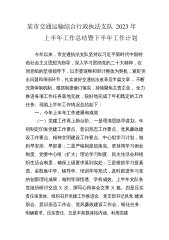 某市交通运输综合行政执法支队2023年上半年工作总结暨下半年工作计划今年以来,市交通执法支队坚持以习近平新时代中国特色社会主义思想为指导,深入学习贯彻党的二十大精神,在局党组的坚强领导下,以市委巡察和审计整改为契机,紧盯突出问题和薄弱环节,扎实做好交通执法改革后半篇文章,不断完善体制机制,狠抓制度修订落实,持续聚焦主责主业,全力推进各项工作任务落地见效,较好地完成了年初既定的工作任务。现就上半年工作情况总结如下:一、今年上半年工作进展和成效(一)党建工作再上新台阶。一是理清思路早谋划。年初制定印发党建工作要点、意识形态工作要点、党风廉政建设工作要点、精神文明建设工作要点、中心组学习计划,做到早...