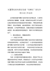 X某市民政局基层党建“亮晒比”创先争优行动工作总结全市基层党建“亮晒比”创先争优行动开展以来,X某市民政局坚持以“庸懒散、怠乱飘、推拖绕”深化治理工作为抓手,以推进“最强党支部”建设提质升级为载体,不断创新理论教育模式、深化作风建设、健全制度机制,党员干部综合能力、服务效能、工作效率明显提高,党建业务融合式发展效能有效彰显,群众满意度得到显著提升。现将工作开展情况总结如下。一、强化顶层设计,明确目标导向(一)制定工作方案。为某市民政局基层党建“亮晒比”创先争优行动取得实效经局党组研究审议,先后制定印发了《X某市民政局基层党建“亮晒比”创先争优行动方案》《X某市民政局基层党建“亮晒比”创先争优行...