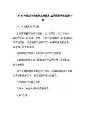 2023年国家平安知识竞赛题库[总体国家平安观]附答案一、填空题(共28题)1.国家平安工作应当坚持,以()为宗旨,以()为根本,以()为根底,以军事、文化、社会平安为保障,以促进国际平安为依托,维护各领域国家平安,构建国家平安体系,走中国__家平安道路。总体国家平安观人民平安政治平安经济平安2.()负责国家平安工作的决策和议事协调,研究制定、指导施行国家平安战略和有关重大方针政策,统筹协调国家平安重大事项和重要工作,推动国家平安法治建立。中央国家平安领导机构3.每年()为全民国家平安教育日。4月15日4.国家坚持()的领导,维护中国特色社会制度,开展社会民主政,健全社会法治,强化权利运行制约...