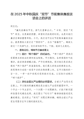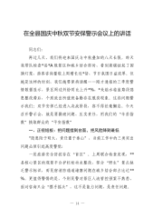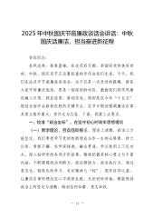 在2025年中秋国庆“双节”节前集体廉政谈话会上的讲话同志们:“廉风劲拂佳节至,清气长盈事业兴。”中秋、国庆“双节”将至,这是阖家团圆、举国欢庆的美好时刻,也是对我们廉洁自律的重要考验。今天,我们召开这次节前集体廉政谈话会,就是要给大家打打“预防针”、念念“紧箍咒”,确保大家过一个风清气正、欢乐祥和的节日。下面,我讲几点意见。一、提高站位,明晰节日廉政要义(一)践行“两个维护”的试金石。“两个维护”是我们党最根本的政治纪律和政治规矩。节日期间,各种诱惑和干扰增多,能否保持清醒头脑,严守纪律规矩,是对我们是否真正做到“两个维护”的直接检验。我们要从讲政治的高度出发,把思想和行动统一到党中央的决策...