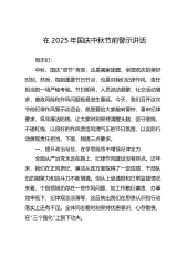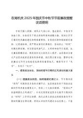 “”街道党工委书记在中秋、国庆双节节前集体廉政谈话会议上的讲话同志们:“”中秋、国庆双节将至,在这个重要节点,我们召开这次集体廉政谈话会议,目的是进一步增强大家的廉洁自律意识,筑牢拒腐防变的思想防线,确保节日期间风清气正。下面,我讲三个方面的意见。一、筑牢思想堤坝,绷紧廉洁之弦(一)强化政治自觉,站稳立场“”政治自觉是党员干部的立身之本、从政之基。在双节这个特殊时期,我们更要强化政治自觉,始终站稳政治立场。要深入学习贯彻XXX新时代中国特色社会主义思想,深刻领“”“”“悟两个确立的决定性意义,增强四个意识、坚定四个自”“”信、做到两个维护。“”双节期间,各种人情往来增多,社会关注度高,我们的一...