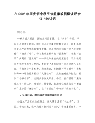 XX在XX公司国庆中秋双节前警示教育大会上的廉洁谈话材料同志们:大家好。再过不久,就是万家团圆的中秋佳节和举国同庆的国庆节。在这个美好的时刻,公司党委专门组织召开这次警示教育大会,开展一次集体的廉洁谈话,我的内心感受和大家一样,不是为了走过场、讲形式,更不是要给大家的节日心情“添堵”,而是觉得非常有必要。越是喜庆祥和的氛围,越要保持一份清醒和冷静;越是阖家欢乐的时刻,越要绷紧纪律和规矩这根弦。今天,借这个机会,不讲工作成绩,只结合一些案例和思考,与各位同志作一次坦诚的、交心式的交流,希望能共同筑牢思想防线,过一个真正廉洁、祥和、安宁的节日。下面,我主要从三个方面,谈几点个人的体会和反思。一、以...