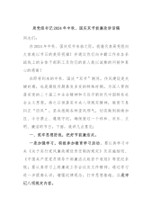 2024年中秋、国庆双节前夕单位领导廉政讲话稿(2篇)同志们:在2024年中秋、国庆双节来临之际,我谨代表局党组向大家致以节日的美好祝福!并通过你们向辛勤工作在各条战线上的全体干部职工及你们的家人致以诚挚的问候和衷心的感谢!在即将到来的中秋、国庆“双节”期间,作风建设是关键时期,也是腐败问题易发多发的特殊时期。为深入贯彻落实党的二十届三中全会精神和习近平新时代中国特色社会主义思想,持之以恒落实中央八项规定精神,驰而不息纠正“四风”,坚决抵制各种歪风邪气,切实做到持续加压、令行禁止、遵规守纪,确保度过一个祥和、欢乐、文明、廉洁的节日,下面,我讲几点意见:一、筑牢思想防线,把好节前廉洁关。一是加强...