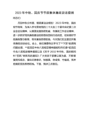 在2023年中秋国庆节前集体廉政谈话上的讲话谈话提纲同志们:中秋、国庆节将至,节日期间是违规违纪问题的高发期,在这样一个关键节点开展集体谈话是加强对党员干部日常教育监督的必要措施,提醒全体党员干部要严格落实中央八项规定精神,时刻紧绷党风廉政这根弦,坚决抵制"四风",自觉担负起全面从严治党的主体责任。刚才会议传达学习了《中国共产党章程》第七章党的纪律相关内容,通报了中央纪委国家监委公开通报的十起违反中央八项规定典型问题,并集中观看了廉政微视频《虚位以待》,目的就是进一步巩固中央八项规定成果,提醒全局党员干部要自觉增强廉洁意识,始终保持清醒的头脑和清廉的本色,营造风清气正、平安和谐的节日氛围。为切...