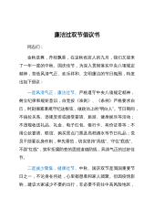 目录2023年中秋、国庆节前集体廉政谈话提纲县纪委书记在中秋、国庆节前的廉政讲稿2023年中秋、国庆节前集体廉政谈话提纲同志们:两袖清风赏明月,全家团圆共婵娟。在2023年中秋、国庆双节来临之际,为深入贯彻落实中央、省、市关于廉洁过节的部署要求,持之以恒落实中央八项规定精神,驰而不息纠治"四风",坚决抵制各种歪风邪气,切实做到持续加压、令行禁止,确保文明过节、节俭过节、廉洁过节,坚决抵制“节日腐败”,营造廉洁文明、风清气正的节日氛围,今天我们在这里召开集体廉政谈话会,下面,我讲几点意见与大家共勉:一、提高站位,认清形势,时刻保持敬畏之心。党的二十大报告强调,“全面从严治党是党永葆生机活力、走好...