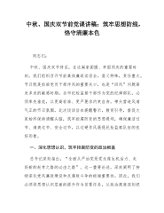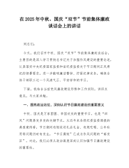 中秋国庆双节前廉洁专题党课:严于律己筑防线,清廉过节守初心同志们:在2025年中秋、国庆双节即将来临的重要时间节点,我们组织召开这次廉洁专题党课,目的十分明确,就是要提前敲响警钟、严明纪律要求,引导全体党员干部在欢度佳节的同时,时刻绷紧廉洁自律这根弦,筑牢拒腐防变的思想防线,确保节日期间风清气正。节日是检验党性原则和作风建设成效的试金石,也是对每一位同志纪律观念和廉洁意识的重要考验。越是关键时刻,越要保持清醒头脑;越是人情往来频繁,越要恪守纪律规矩。今天我的党课主题是:“严于律己筑防线,清廉过节守初心”。围绕主题与大家交流三个方面的内容。一、把握全面从严治党时代要求,切实增强廉洁过节的政治自觉...