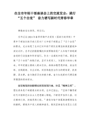 在全市年轻干部座谈会上的交流发言:践行“五个自觉”奋力谱写新时代青春华章尊敬的各位领导,同志们:总书记在2024年春季学期中央党校(国家行政学院)中青年干部培训班开班之际对广大年轻干部提出了“五个自觉”的要求,充分体现了总书记对年轻干部队伍建设的高度重视和深切关怀。总书记的殷殷嘱托和深厚期待是广大年轻干部砥砺奋进的行动指南和科学指引,作为一名高校年轻干部,要坚定做“五个自觉”的践行者,坚守为党育人、为国育才的初心使命,牢牢把握立德树人根本任务,持续加强思想淬炼、政治历练、实践锻炼、专业训练,刻苦练就担当作为的硬脊梁、铁肩膀、真本事,奋力跑好历史的接力棒,奋力扛起新时代建设教育强国的使命担当。自...
