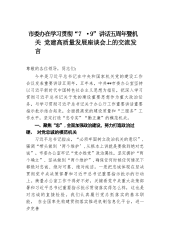 市委办在学习贯彻“7·9”讲话五周年暨机关党建高质量发展座谈会上的交流发言尊敬的各位领导,同志们:今年是习近平总书记在中央和国家机关党的建设工作会议发表重要讲话五周年。五年来,中共**市委办公室坚持以习近平新时代中国特色社会主义思想为指引,把深入学习贯彻习近平总书记关于党的建设重要思想作为重大政治任务,与学习贯彻习近平总书记关于办公厅工作重要讲话重要指示批示结合起来,全面提高党的建设质量和“三服务”工作水平,坚定打造“忠专实”“勤正廉”的模范机关。一、聚焦“忠”,全面加强政治建设,努力打造政治过硬、对党忠诚的模范机关习近平总书记指出,“必须牢固树立政治机关的意识”,强调“带头做到‘两个维护’,...