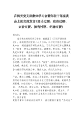 在机关党支部集体学习会暨年轻干部座谈会上的交流发言(理论过硬、政治过硬、宗旨过硬、担当过硬、纪律过硬)同志们:结合党支部党纪学习安排,我重温了《习近平著作选读》,深刻感受到党的十八大以来,以习近平同志为核心的党中央高度重视干部队伍建设,习近平总书记多次强调党员干部要树立正确的权力观、政绩观、事业观。年轻干部是党和国家事业的生力军,正处在成长成才的黄金期,更加应当自觉加强党性锻炼修养,坚持理论过硬、政治过硬、宗旨过硬、担当过硬、纪律过硬,做到五个“自觉”,树牢正确的权力观、政绩观、事业观,努力成为可堪大用、能担重任的栋梁之材,奋力跑好历史的接力棒。借此机会,我谈几点体会。第一,要坚持理论过硬,自...