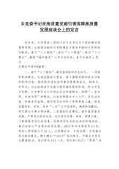 乡党委书记在高质量党建引领保障高质量发展座谈会上的发言近年来,乡党委深入贯彻习近平总书记关于党的建设的重要思想,全面落实新时代党的建设总要求和新时代党的组织路线,着力“三个狠抓”,深化“三个聚焦”,紧扣“三个重点”,围绕“强村富民”三年行动目标,奋力在城市x现代化建设中谱写*篇章。一、着力“三个狠抓”,激发基层组织内生动力。一是狠抓阵地建设,打造坚强战斗堡垒。着力增强党组织政治功能和组织功能,狠抓组织活动场所建设管理规范化、制度化、科学化,为全面推进乡村振兴提供高效服务阵地。把为村民办好事、办实事作为工作的出发点和落脚点,按照“一室多用、多室共用”的要求,打造党群服务中心大厅、党员活动室、科普...