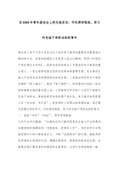 在2024年青年座谈会上的交流发言:守纪律讲规矩,努力作忠诚干净担当的好青年通过深入学习习近平总书记关于党纪学习教育的重要讲话重要指示精神和中央、省委党的建设工作领导小组会议精神,研读《中国共产党纪律处分条例》,我更加深刻的领会了开展党纪学习教育的重大意义。一是全面贯彻落实党的自我革命的重要思想,有力推动全面从严治党在自然资源领域向纵深发展;二是推动系统党员干部坚定拥护“两个确立”,做到“两个维护”,将思想和行动统一到自然资源事业高质量发展上来;三是教育引导系统广大党员干部践行忠诚干净担当,锻造高素质自然资源干部队伍,有力推动自然资源工作“走在前、作示范”,更好维护人民群众的资源权益。我们要自...