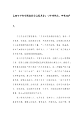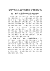 在机关党支部集体学习会暨年轻干部座谈会上的交流发言(理论过硬、政治过硬、宗旨过硬、担当过硬、纪律过硬)同志们:结合党支部党纪学习安排,我重温了《习近平著作选读》,深刻感受到党的十八大以来,以习近平同志为核心的党中央高度重视干部队伍建设,习近平总书记多次强调党员干部要树立正确的权力观、政绩观、事业观。年轻干部是党和国家事业的生力军,正处在成长成才的黄金期,更加应当自觉加强党性锻炼修养,坚持理论过硬、政治过硬、宗旨过硬、担当过硬、纪律过硬,做到五个“自觉”树牢正确的权力观、政绩观、事业观,努力成为可堪大用能担重任的栋梁之材,奋力跑好历史的接力棒。借此机会我谈几点体会。第一,要坚持理论过硬,自觉做党...