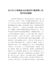XX市人大常委会主任党纪学习教育第二次研讨发言提纲自党纪学习教育以来,通过参加读书班、座谈交流、集中学习讨论、进行个人自学、开展警示教育等形式,深入学习了习近平总书记关于党的纪律建设重要论述和党纪学习教育重要指示批示精神,深学细照《条例》,坚持做到学思用贯通、知信行统一。一是学出了政治清醒。通过学习教育,进一步增强了对党的纪律建设重要性必要性的认识,充分认识到讲政治纪律和政治规矩是最根本、最重要的纪律,人大工作者必须做政治上的明白人,坚定不移听党话、跟党走,树牢“四个意识”、坚定“四个自信”、做到“两个维护”,在大是大非面前、在政治原则问题上做到头脑特别清醒、立场特别坚定,始终站稳政治立场、人...