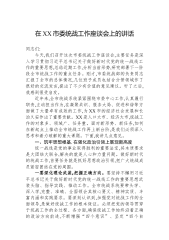 在XX市委统战工作座谈会上的讲话同志们:今天,我们召开这次市委统战工作座谈会,主要任务是深入学习贯彻习近平总书记关于做好新时代党的统一战线工作的重要思想,总结近期工作,分析当前形势,研究部署下一阶段全市统战工作的重点任务。刚才,市委统战部的负责同志汇报了全市的总体情况,几位班子成员也结合分管领域作了很好的交流发言,提出了不少有价值的意见建议。听了之后,我感到很受启发。近年来,全市统战系统紧紧围绕市委中心工作,认真履行职责,主动担当作为,在凝聚共识、服务大局、促进和谐等方面做了大量卓有成效的工作,为XX市的经济社会发展和长治久安作出了重要贡献。XX是人口大市、经济大市,统战工作的对象多、领域广、...