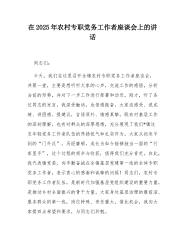 在XX镇农村专职党务工作者座谈会上的讲话同志们,各位年轻的党务工作者们:大家下午好。今天,我们在这里召开一个非常重要的会议——XX镇农村专职党务工作者座谈会。刚才,听了大家的发言,我深受触动,也倍感振奋。你们当中,有的同志分享了从初到基层的“门外汉”,一步步摸索,逐渐成长为群众工作“行家里手”的心路历程;有的同志感慨,几年扎根下来,最大的收获是眼里能看见群众的难处,心里能装得下群众的期盼,真正把“务实”二字刻进了骨子里;还有的同志提炼了宝贵的工作方法,认为基层工作本质上就是群众工作,必须坚持从群众中来、到群众中去。大家的发言,有对成功经验的深刻提炼,有对现实难题的精准剖析,更有对未来工作的思路...