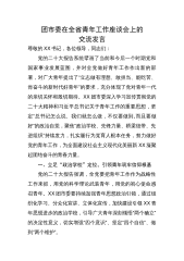 团市委在全省青年工作座谈会上的交流发言尊敬的XX书记,各位领导,同志们:党的二十大报告系统擘画了当前和今后一个时期党和国家事业发展蓝图,并对全党做好青年工作作出新的部署,对广大青年提出了“立志做有理想、敢担当、能吃苦、肯奋斗的新时代好青年”的要求,充分体现了党对青年一代的亲切关怀和殷切期待。XX团市委深入学习宣传贯彻党的二十大精神和习近平总书记关于青年工作的重要思想,坚定“总书记怎么说、我们就怎么做,不仅要做到,而且要做好”的政治自觉,聚焦“政治学校、先锋力量、桥梁纽带、先进组织”持续发力,扎实履行为党育人根本任务,努力做好党的青年工作,为全面建设社会主义现代化美丽新XX凝聚起团结奋斗的青春力...