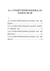 一、青年干部座谈会讲话、发言篇(79篇)...........91、在扎根基层扬帆逐梦青年干部座谈会上的讲话....92、在蹲苗基层锤炼本领青年干部座谈会上的讲话..103、在青年干部座谈会上的讲话...........................114、在青年干部座谈会上的讲话...........................125、村党总支书记在青年干部座谈会上的发言.........146、村党总支副书记在青年干部座谈会上的发言.....157、村党支部书记在全县青年干部座谈会上的发言..168、大学生村文书在全县年轻干部座谈会上的发言..219、村大学生文书在全县青年干部座谈会...
