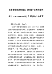 在市委党校贯彻落实《全国干部教育培训规划(2023—2027年)》座谈会上的发言 尊敬的各位领导,同志们: 《全国干部教育培训规划(2023—2027年)》强调要“持续深化党的创新理论武装,强化政治训练,加强履职能力培训,深入推进干部教育培训体系改革创新,增强教育培训的时代性、系统性、针对性、有效性”,为党校抓好教学工作指明了方向,提出了要求。党校教育中的教学布局培训设计、方式方法、机制保障与提升教学质量密切相关各级党校应注重从这四个方面入手,推进教学改革创新,以更好适应“增强教育培训的时代性、系统性、针对性、有效性”要求。下面,我谈几点浅见,以供大家参考。 第一,要完善教学布局。坚持把...